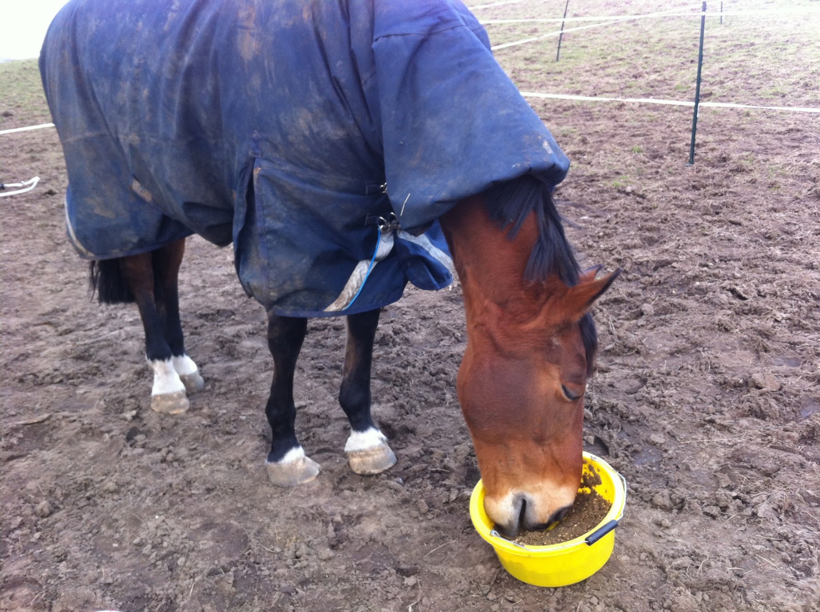 Remi eating his copra, alfa A cubes, oats, micronised linseed, speedibeet, copper, zinc, salt, brewers yeast, mint, Magnesium Oxide :-)