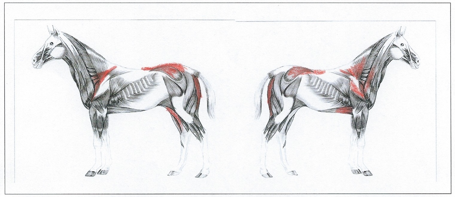 Quarters: - Tight hamstrings, - semitendinosus, glutes and lumbo-sacral junction.  Still tender right inner thigh – sartorius region.
