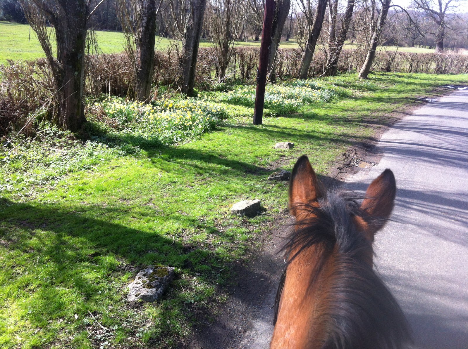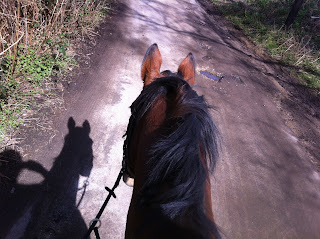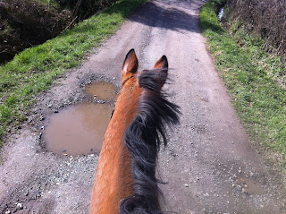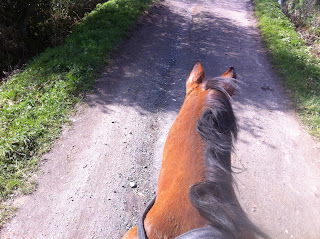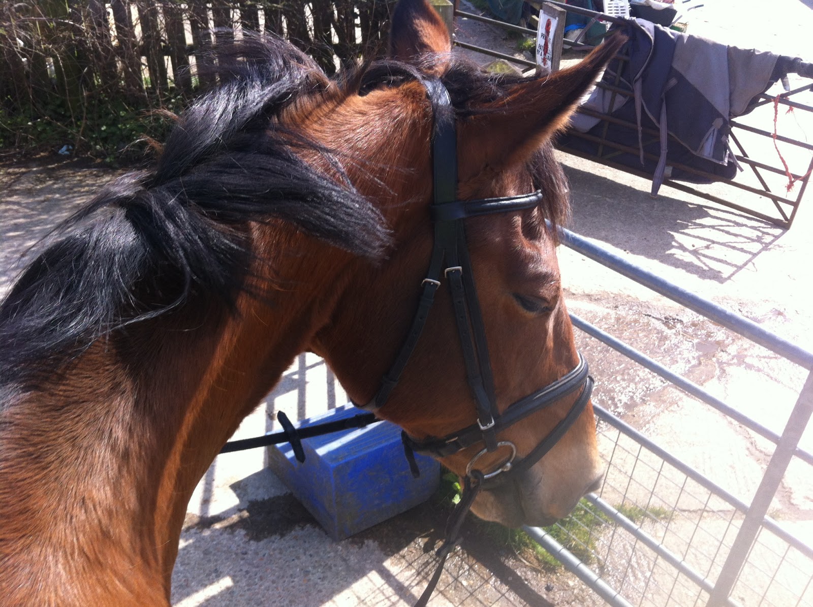 Yesterday Remi and I managed an hours solo hack. He didn't hesitate once. Met loads and loads of cars, cyclists, walkers, kids, golfers, picnickers etc. It was sunny but very windy. Ears pricked and enjoying sun. So pleased. Big step for us. :-)