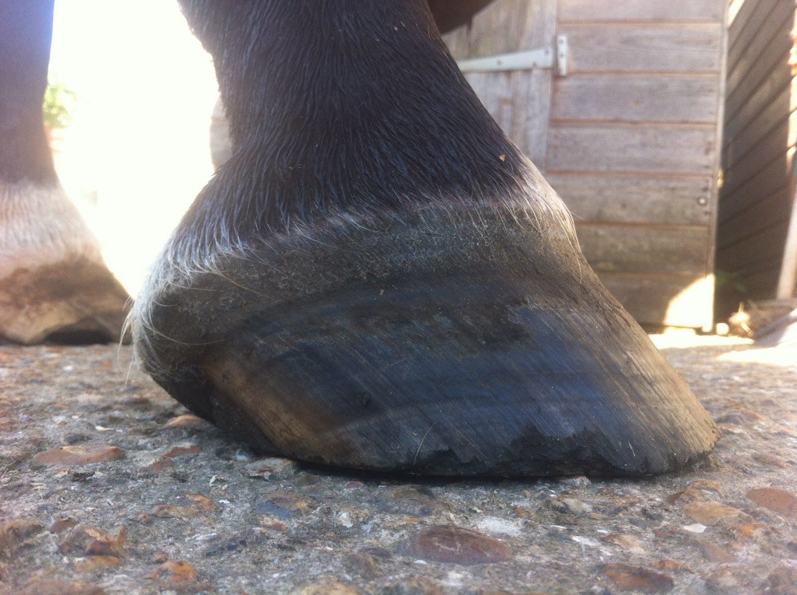 Front left. Showing the deviation that has broken off. That doesnt bother Remi, and I am not worried about it. Am a bit worried though about the vertical cracks in outer hoof wall. Any thoughts on these?